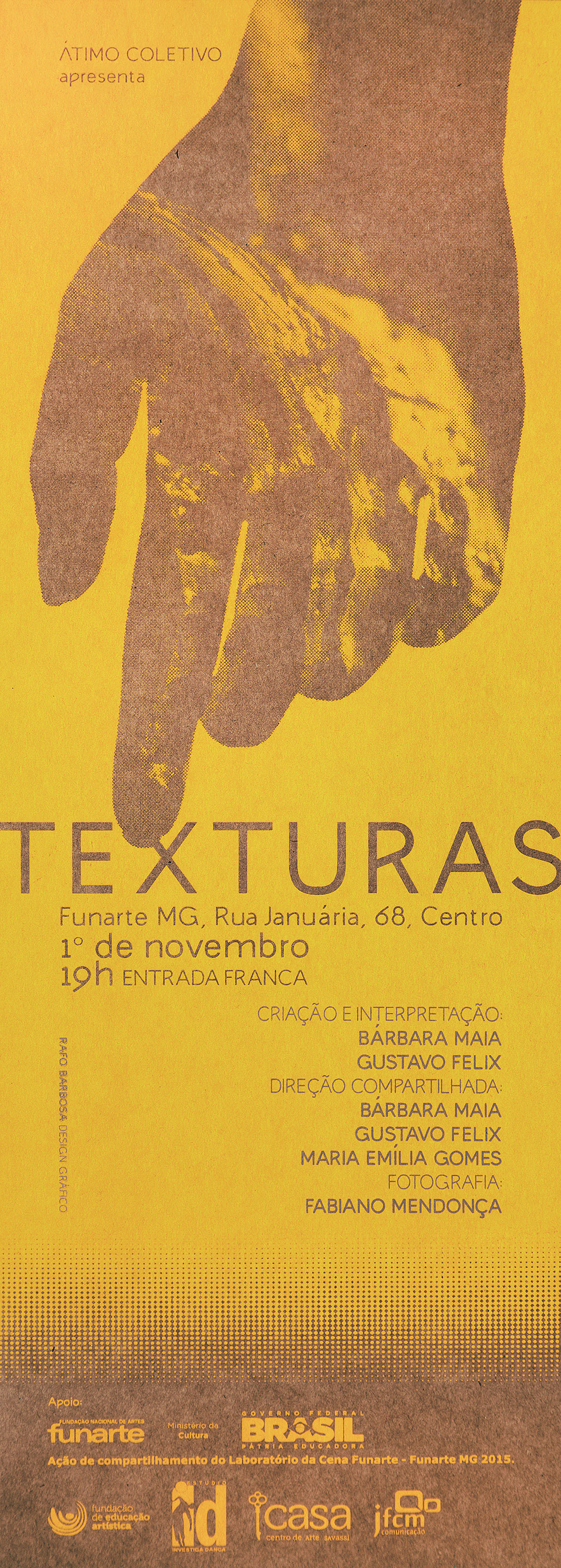Criação de cartazes. "Texturas" e "Ecos de um corpo quase sólido" são espetáculos de Dança e Música concebidos pelo Átimo Coletivo através do "Laboratório da Cena Funarte - Funarte MG 2015".